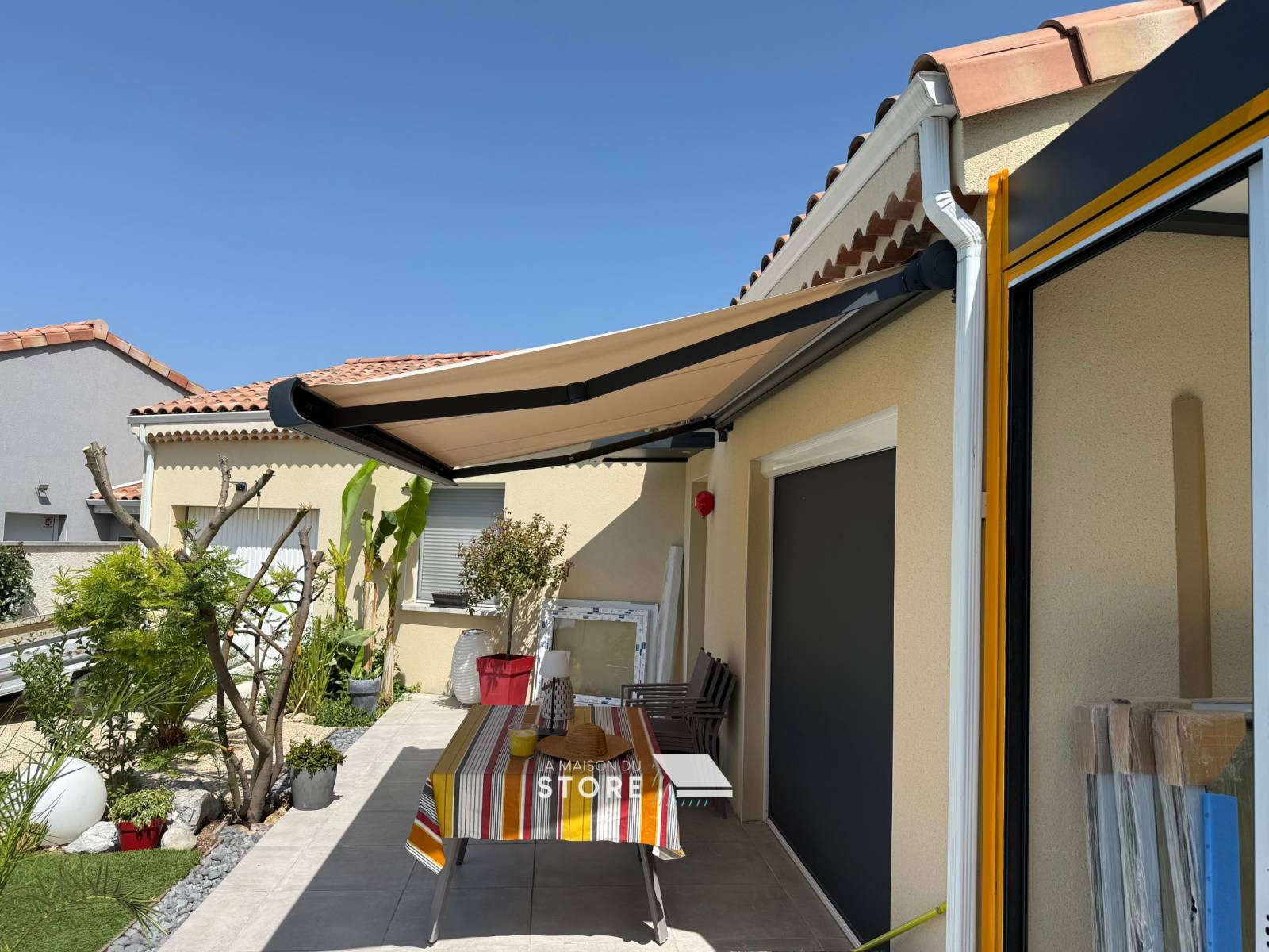 À Espeluche (26780), proche de Montélimar (26200), La Maison du Store a récemment installé un store banne coffre motorisé équipé d’un capteur vent SOMFY io, alliant design, robustesse et sécurité.