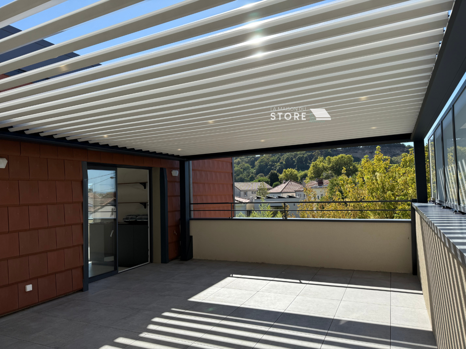 La motorisation est confiée à un vérin électrique SOMFY io, garantissant un pilotage fluide et silencieux. Trois spots LED intégrés viennent parfaire l’ambiance. La structure gris anthracite (RAL 7016) et les lames blanches (RAL 9016) s’intègrent avec élégance dans tout environnement architectural.