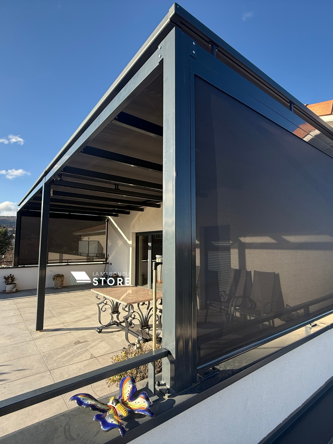 Pour les côtés vitrés, un store screen ZIP vertical motorisé complète l’équipement, avec guidage par coulisses ZIP, caisson carré en aluminium, et barre de charge 30 × 28 pour une tenue optimale. La toile Mermet 5500 est particulièrement adaptée pour filtrer la luminosité et limiter l’échauffement, tout en conservant une bonne lisibilité vers l’extérieur selon l’exposition. À titre indicatif, la performance au vent annoncée peut atteindre 95 km/h sur une configuration de référence, ce qui souligne la robustesse du système ZIP lorsqu’il est correctement dimensionné et posé.