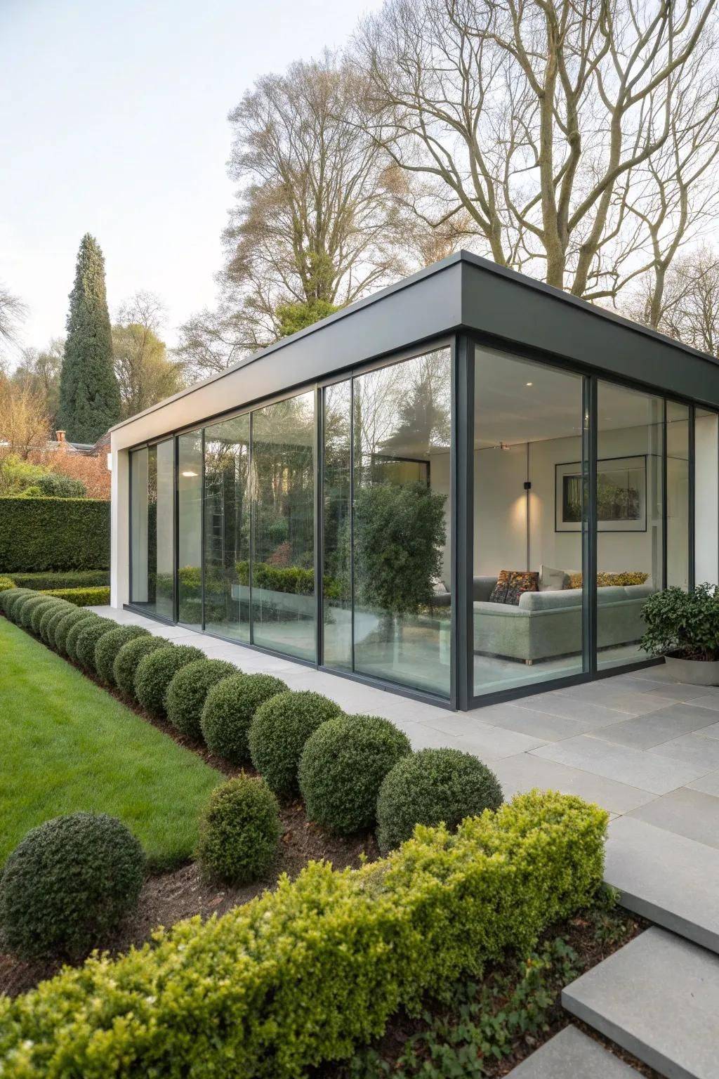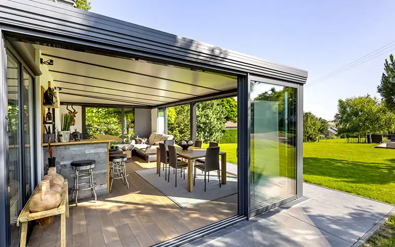 Selon l’usage souhaité, la toiture peut être conçue avec des panneaux isolants (pour un vrai confort en toutes saisons), du vitrage (pour maximiser la lumière) ou une combinaison des deux, afin d’obtenir le bon équilibre entre clarté, protection solaire et performance thermique. Les vitrages verticaux, quant à eux, offrent une belle ouverture sur le jardin et apportent un rendu très “architectural”, moderne et élégant.